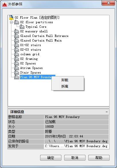 使用关联菜单,可以卸载、重新加载或拆离附着的外部参照。