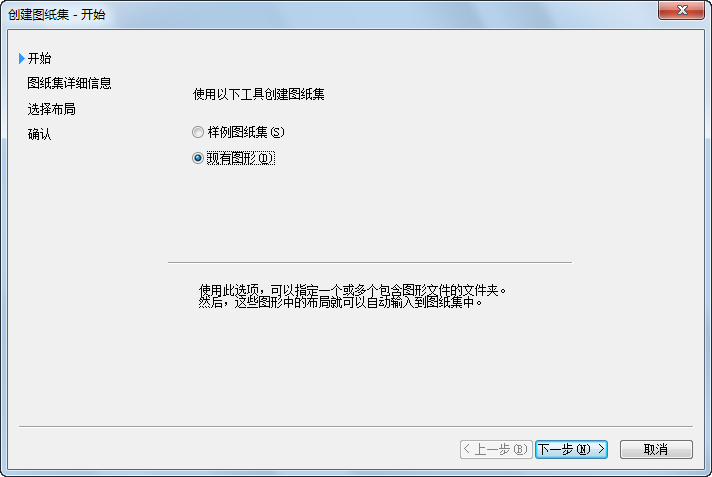- 在“使用以下工具创建图纸集”下,选择“现有图形”,然后单击“下一步”。