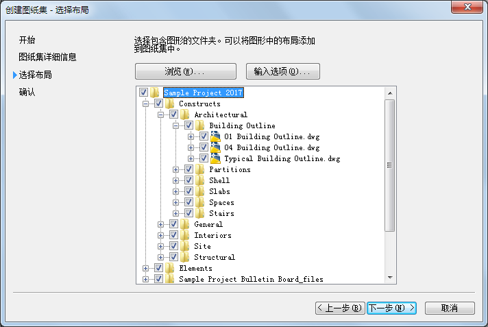 - 若要使用文件名作为图纸标题的前缀,或基于文件夹结构创建图纸集的子集,请单击“输入选项”,选择相应选项,然后单击“确定”。