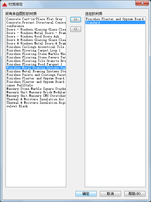 列出图形中所有可用的 AutoCAD 定义的材质。