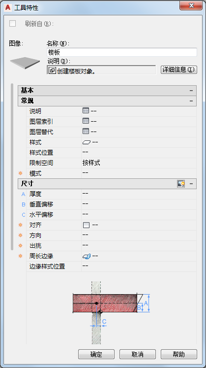 楼板工具特性,其中一个楼板边缘样式的设置为默认值。