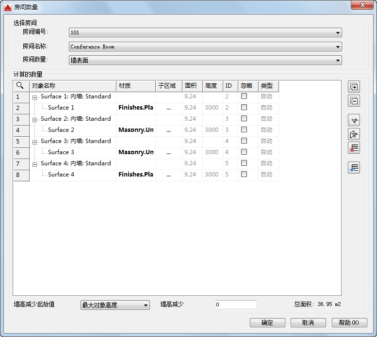- 选择计算的房间土方量:墙表面、楼板表面、天花板表面、房间周长和家具对象。根据选定的房间土方量,计算的对象和值将在表中列出。将为每个房间(空间)单独列出房间土方量。