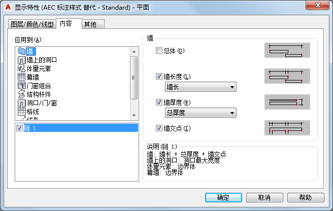 示例:在第一条链中,您想要标注墙长和墙交点。为“应用于”选择“墙”。