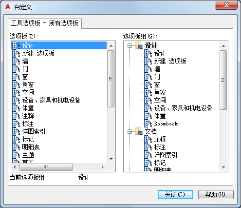 左侧将列出所有可用选项板。右侧将列出所有选项板组。空的项目工具选项板组也会在右侧列出。