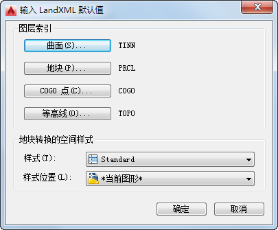 如果您没有为 LandXML 数据定义特定的图层索引,所输入的数据将放在为 LandXML 数据、TINN(曲面)、PRCL(地块)、COGO(COGO 点)和 TOPO(等高线)指定的默认图层索引上。