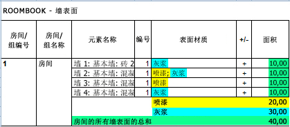 墙表面列中有关每房间的和全部的窗口面积的信息都可以在 Excel 文件中的“所有房间土方量的测量”选项卡中找到。