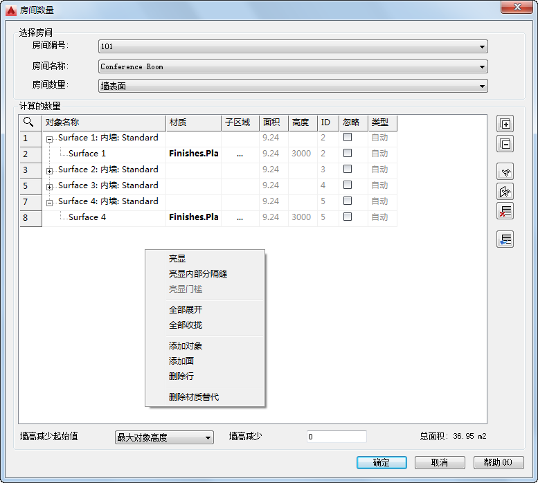 - 对于每个计算的房间土方量(墙表面、楼板表面和天花板表面),请单击浏览按钮