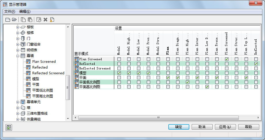 在右窗格中,行列出该对象的显示模式,列则列出显示集。显示集下方的勾选标记表示在该显示集中使用此显示模式。同一显示模式可用于多个显示集中。