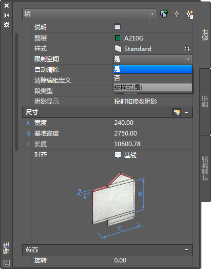 注: 如果在 AutoCAD Architecture Object Enabler 环境(例如 AutoCAD、Civil 3D 或 Land Desktop)中打开图形,或者将 AutoCAD Architecture 作为 AutoCAD 运行,则不会显示“限制空间”特性。该特性仅在 AutoCAD Architecture 或 AutoCAD MEP 的完全安装中才会显示。