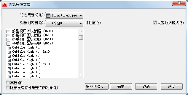 | 仅显示已附着选定特性集定义的对象 | 选择“隐藏没有特性集定义的对象”。 |