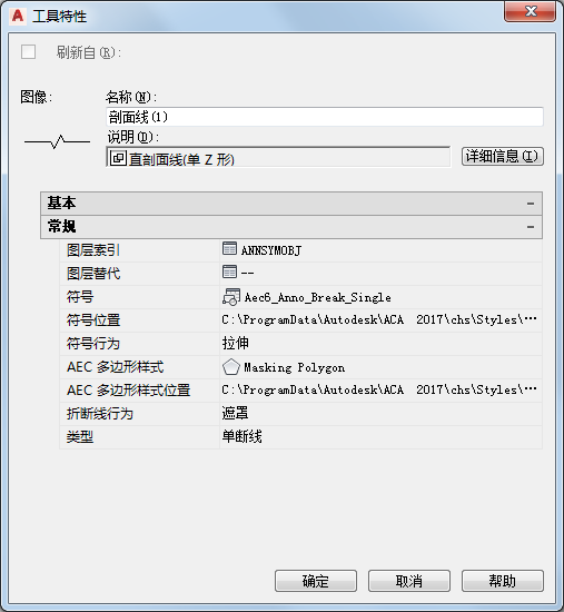| AEC 多边形样式 | 指定折断线是否具有遮罩特性。如果该特性为“未指定”(--),则样式将默认为标准样式。 |