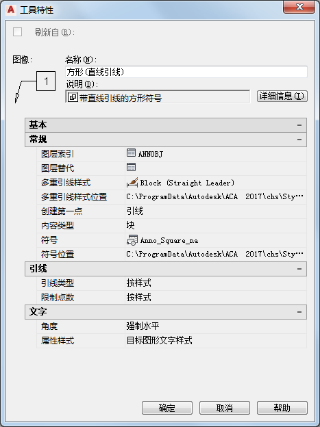 | “引线”/“引线标注样式位置” | 指定标注样式的位置(如果该标注样式不同于当前图形的标注样式)。单击特性并使用下拉列表中的“浏览”选项可定位并输入该选定样式的路径。如果该特性为“未指定”(--),则只使用当前图形中的样式。 |