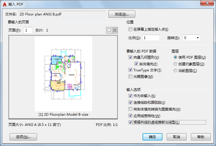 - 您可以为输入的对象指定不同的输入比例因子。从 PDF 文件输入页面时,不使用 INSUNITS 系统变量的设置,因为每个页面的比例可能有所不同。