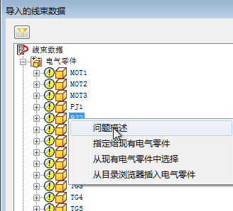 “已输入的线束数据”对话框中的浏览器节点包含从 AutoCAD Electrical 输入的电气元件和导线。