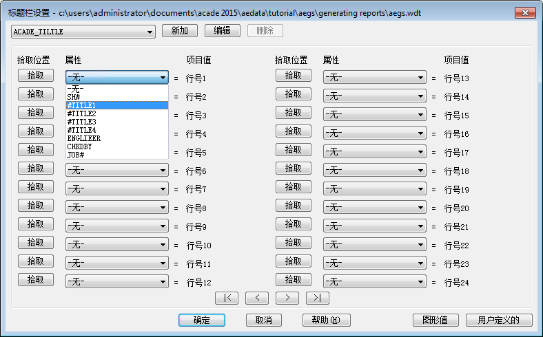 “标题栏设置”将读取属性定义。将显示“标题栏设置”对话框。每个下拉列表都包含在图形中找到的所有属性定义对象。