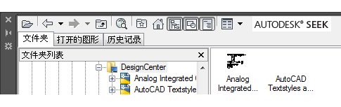 “文件夹”、“打开图形”和“历史记录”选项卡,以及位于右上方的“Autodesk Seek”按钮提供多种方法来访问内容。