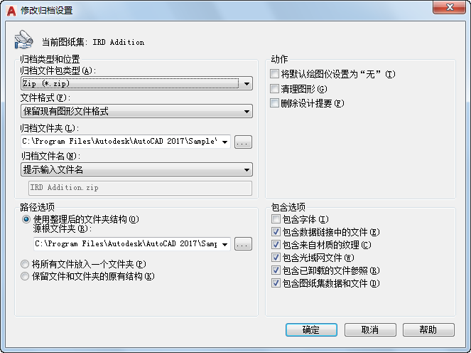 更改归档的图纸集文件包的路径、默认格式、组织和其他设置。