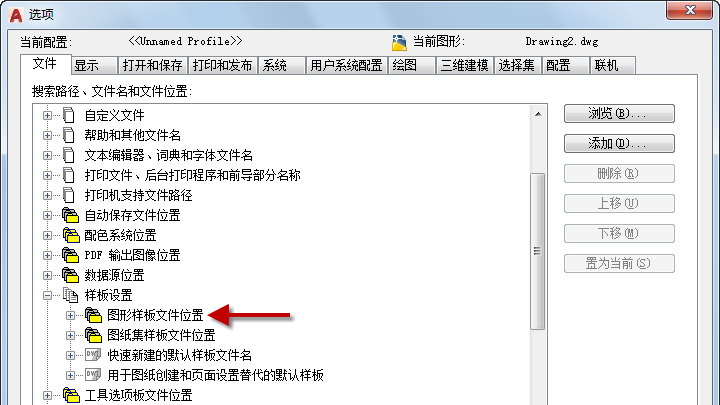 图形样板 (DWT) 文件用于创建新图形。使用 DWT 文件创建的图形包括 DWT 文件中定义的所有样式和图形对象。早期版本中的自定义 DWT 文件将移植到根据从中移植它们的版本所命名的子文件夹中;子文件夹的命名约定是 产品名称 样板。产品名称 样板子文件夹在“图形样板文件位置”设置定义的文件夹下创建。