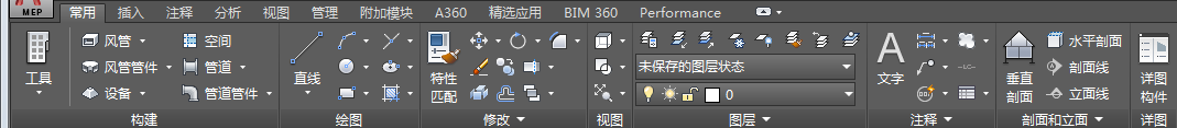 功能区是用于访问 AutoCAD MEP 中的命令的中心位置。功能区是按选项卡组织的;这些选项卡反映了绘图过程中的常见任务。有两种选项卡:
