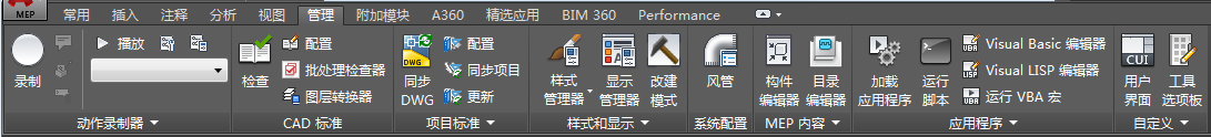 - MEP 内容。提供用于启动构件编辑器和目录编辑器的命令。展开的面板提供用于修改、测试和迁移目录数据的工具,以及用于批量转换和分解图形构件的工具。