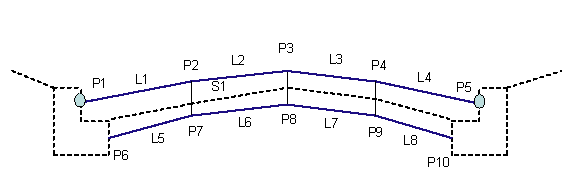 此部件用于按照所需的坡度和坡度变化范围在每一侧的边沟(在流线之间)上叠加四车道拱形道路。此部件不同于“两边之间叠加横断道路”部件,因为它是将现有边沟叠加到路缘面上的已知纵断面上,而不是在已知的排水沟边坡顶点之间叠加。