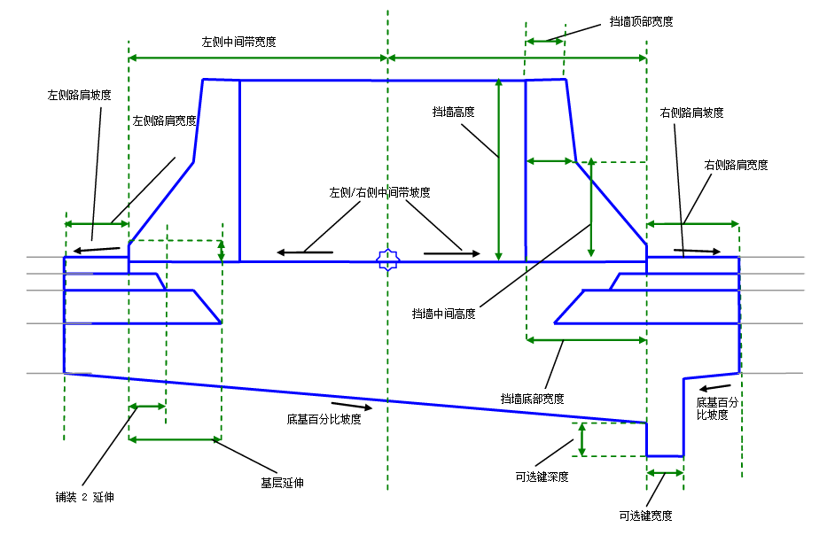| 左侧基层延伸 | 基层超出在左侧的已铺装路肩的边缘并延伸到中间带中的宽度。即使左侧路肩宽度设置为 0,仍提供该宽度。 | 正数 |