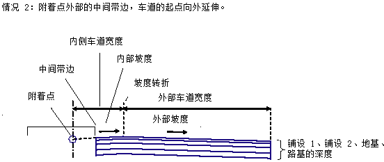 行车道内侧边缘:根据上图中显示的三种情况计算行车道内侧边缘的位置。如果指定了“中间带边缘”路线,并且该路线位于车道的附着点外,将从附着点处以车道坡度向外平移内侧边缘(第二种情况)。如果“中间带边缘”路线位于车道的附着点内,将从附着点处以内侧车道坡度向内平移内侧边缘(第三种情况)。如果未指定“中间带边缘”路线,或者未在里程处找到指定的路线,内侧边缘将保留在附着点处(第一种情况)。