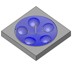 “环切”加工可从指定中心点创建环切刀具路径,从而在指定边界内进行加工时保持固定接触。该方法非常适合于使用 40 度以内刀具接触角加工圆形浅平面零件(组合使用“轮廓”加工路径加工较为垂直的面)。要加工的详图的中心点是自动放置的,也可以由用户指定。该策略还支持刀具接触角。