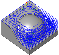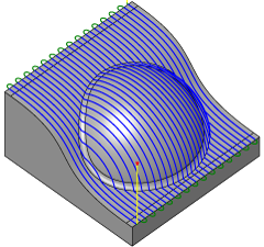 “平行”加工路径是使用最广泛的精加工策略之一。加工路径在 XY 平面中是平行的,并且在曲面上沿 Z 方向延伸。“平行”加工路径最适合加工浅平面区域和向下铣削。若要自动检测浅平面区域,可以将加工限制为刀尖与曲面之间的最大角度。通过选择向下铣削选项,在加工复杂曲面时可将刀具变形减至最小。