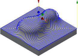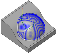 “环绕等距”策略通过沿曲面向内偏移创建彼此之间相距固定距离的加工路径。加工路径沿着斜坡和垂直壁,以保持步距。。虽然“环绕等距”精加工可用于精加工整个零件,但它最常用于沿着“轮廓”和“平行”加工路径组合进行残料加工。与其他精加工策略一样,可通过接触角范围来限制加工。