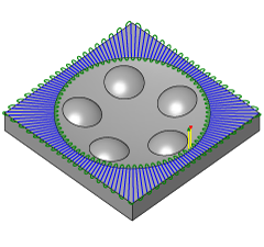 与环切加工一样,径向加工也从中心点开始,支持您加工径向零件。它还提供了在径向刀具路径变得非常密集的位置禁用中心的选项。要加工的详图的中心点是自动放置的,也可以由用户指定。该程序还可以与刀具接触角配合使用。