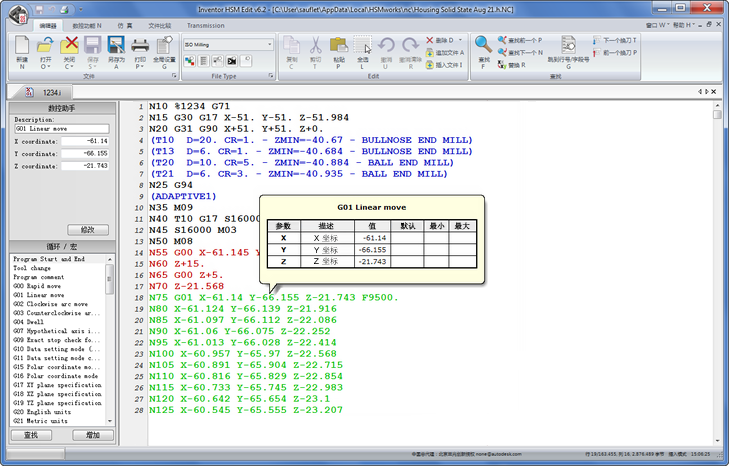 在进行后处理之后,将会在 Inventor HSM Edit 中自动打开生成的 NC 程序。