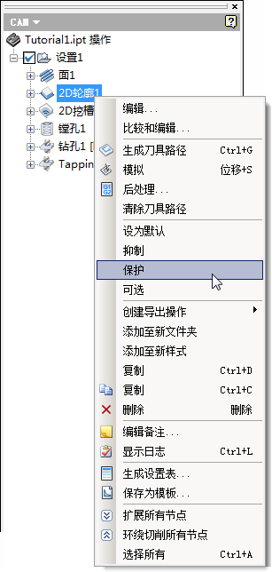 若要保护操作,请在 CAM 浏览器中的操作上单击鼠标右键,然后从弹出式关联菜单中选择“保护”。同样,您可以再次选择“保护”以取消保护。一旦取消保护,操作将自动标记为无效,并且必须重新生成。