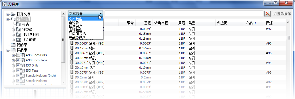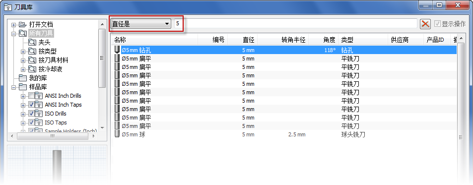 如果您要将搜索限制到特定字段,可以使用其他选项。例如,若要查找直径为 5 毫米的所有刀具,可以选择“直径是”,然后在搜索字段中输入 5。