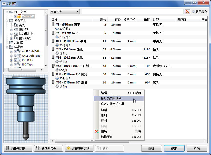 您可以通过在库或刀具列表上单击鼠标右键并从弹出式关联菜单中选择“重新为刀具编号”,在库中将刀具编号更新为按次序排列。