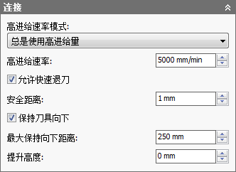 有时,您可能希望使用高进给移动而不是快速移动。在这些情况下,可以在“连接”选项卡中设置高进给速率模式。