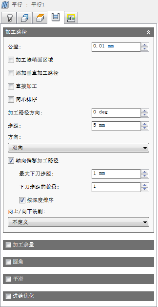 指定加工路径之间的水平步距。默认情况下,该值等于刀具直径减去刀具转角半径所得值再乘以 95%。