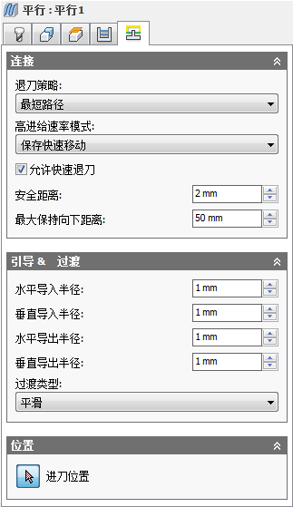 当刀具从进刀移动转到刀具路径本身时垂直弧平滑的半径。