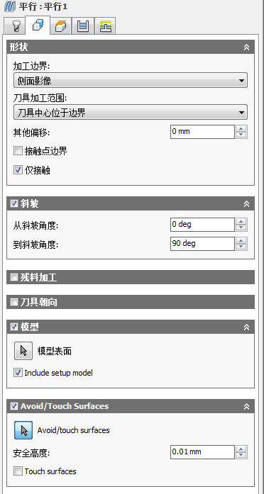 大多数 3D 精加工策略都支持斜坡角度范围。斜坡角度范围的用途之一是将选定刀具路径策略限制到它能达到最佳加工效果的角度。例如,“平行精加工”更适用于加工浅平面区域,而“轮廓精加工”更适用于加工陡峭面区域。