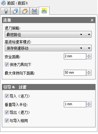 “退刀高度”用于设置在进入下一个切削加工路径之前刀具向上移动的高度。“退刀高度”应设置为高于“进给高度”和“顶部高度”。“退刀高度”与后续偏移一起使用来确立高度。