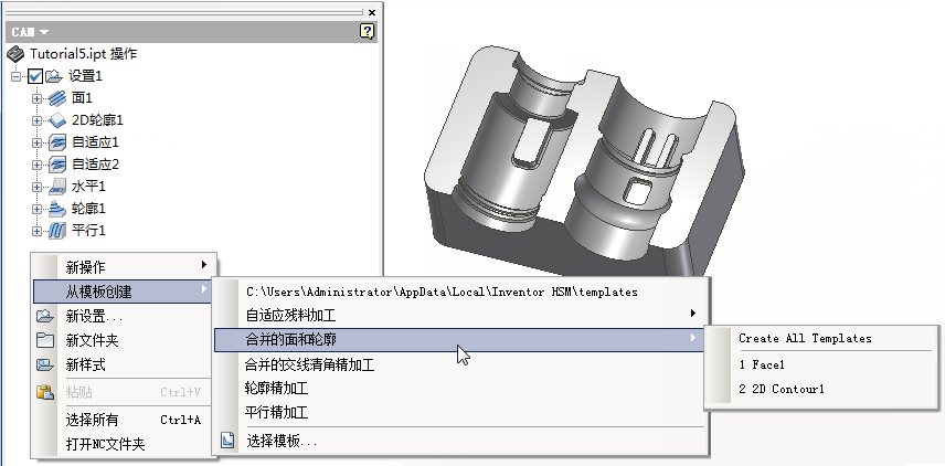 可以使用“从模板创建”菜单项(也可以从 CAM 浏览器弹出式关联菜单访问)从模板创建新操作。所有存储在上次选择的模板文件夹中的模板将会自动列于该菜单项之下。如下图所示,组合模板作为子菜单列出,支持您轻松为所有操作模板创建操作(“创建所有模板”)或者从各个操作模板创建操作。