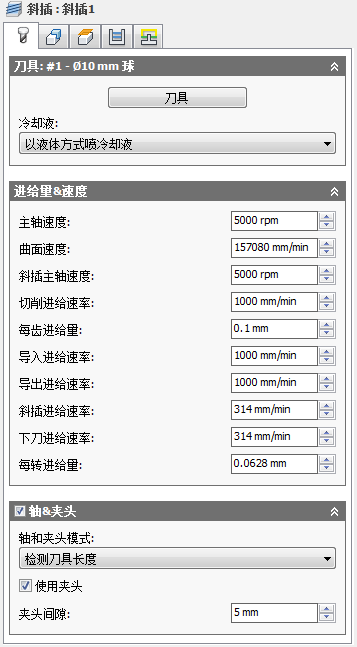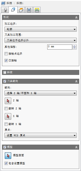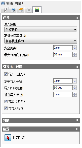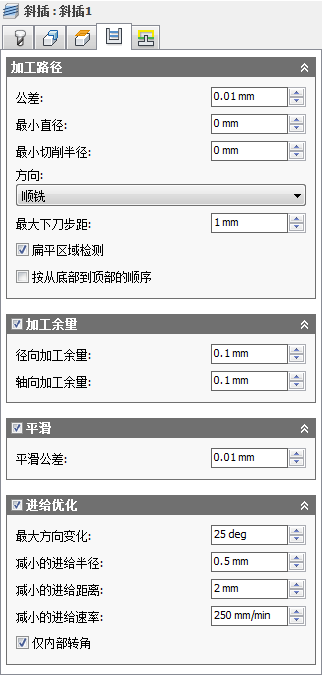 指定在斜插型面上每转的最大下刀步距。该参数允许在斜插过程中执行全宽度切削时限制刀具负载。