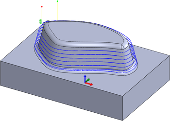 对于不完全水平的曲面,Inventor HSM 会在轴向和径向(壁)加工余量值之间插值,因此在这些曲面的轴向方向上剩余的毛坯量可能不同于指定的值,具体取决于曲面坡度和径向加工余量值。