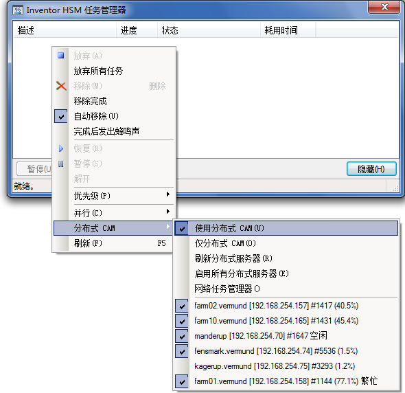 系统会自动使用分布式 CAM(如果可用)。您可以从 Inventor HSM “任务管理器”右键单击上下文菜单手动打开/关闭分布式 CAM(如果需要)。分布式 CAM 会跟踪所有可用的处理资源,以便选择最佳工作站来分载刀具路径计算。