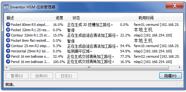 启用了“服务器”列的 Inventor HSM “任务管理器”,显示正在利用哪些工作站。在这种情况下,刀具路径计算在四个不同的工作站以及本地工作站上运行。