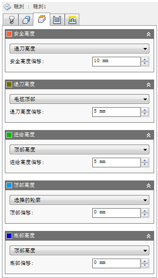 “退刀高度”用于设置在进入下一个切削加工路径之前刀具向上移动的高度。“退刀高度”应设置为高于“进给高度”和“顶部高度”。“退刀高度”与后续偏移一起使用来确立高度。