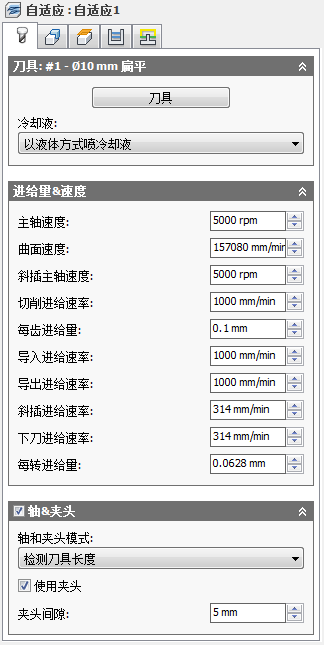在使用带夹头的刀具时,您可以根据加工策略在五种不同的轴和夹头模式之间选择一种模式。可以对刀具的轴和夹头执行碰撞处理,并且可以为它们提供不同的间隙。