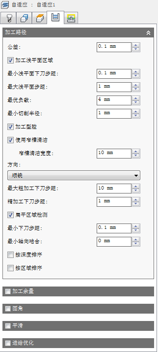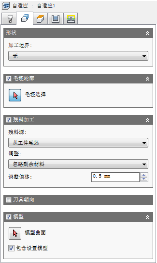 在残料加工中,之前已经使用较大的刀具移除了大部分材料,而必须使用较小的刀具来接触更精细的细部位置,这种情况下也可以使用“自适应清洁”来获得绝佳效果。选择之前的刀具路径后,该策略会考虑在执行选定加工操作之后毛坯的状态,并将加工范围限制到未加工的区域。