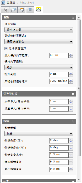 螺旋斜插所需的锥度角。使用此设置可以保持刀具轴稍微远离毛坯,并在斜插期间改进切屑退出。