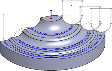 在以下示例中,在具有不同尺寸的三个圆形“阶梯”的零件上使用了 20 毫米的球头刀具。“最大曲面圆角”参数可用于控制加工哪些边。